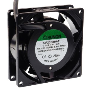 Wentylator AC osiowy 230V o wymiarach 120x120x38mm ma wydajność 161m3/h i pobór mocy 22W. Wykonany z termoplastycznego wirnika i aluminiowej obudowy, działa w zakresie temperatur od -10 do 70°C. Sunon DP200A2123XST.GN