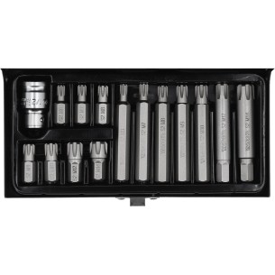 Profesjonalny zestaw końcówek śrubokrętowych Yato YT-04624, wykonany ze stali kwasoodpornej AISI S2, idealny do pracy w trudno dostępnych miejscach, polecany dla serwisów samochodowych i pasjonatów motoryzacji, zapakowany w kasetki z czytelnymi oznaczeniami. YT-04624
