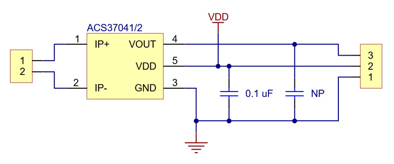 Moduł posiada pięć niezbędnych wyprowadzeń: wejścia prądowe IP+ i IP-, zasilanie logiczne VDD i GND oraz wyjście sygnału VOUT. Napięcie zasilania należy podłączyć do padów VDD i GND oznaczonych na spodzie płytki. Na wyjściu VOUT generowany jest sygnał analogowy o wartości spoczynkowej 2,5 V, która zmienia się proporcjonalnie do natężenia prądu wejściowego. Wzrost prądu w kierunku dodatnim powoduje zwiększenie napięcia wyjściowego, natomiast prąd ujemny skutkuje jego spadkiem.