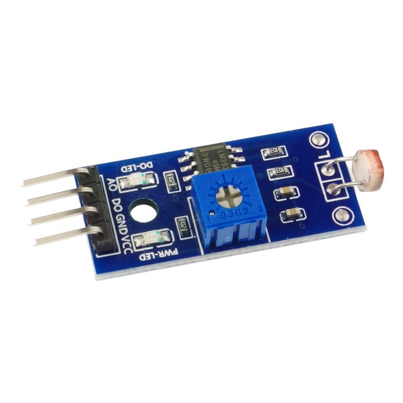 Moduł z czujnikiem światła w postaci fotorezystora. Na płytce umieszczono komparator i potencjometr, który pozwala dostosować próg wykrywania do własnego projektu. Moduł ma wyjście cyfrowe oraz dwie diody led sygnalizujące stan wyjścia i zasilanie. Znajdzie zastosowanie w takich projektach jak np. automatyczna lampka.