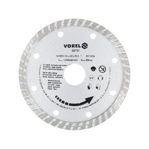 The Vorel 08731 disc with a diameter of 115 mm and a continuous cutting rim is designed for precise cutting of tiles, porcelain and natural stone. Intended for wet operation, it provides cutting accuracy and high durability when used with angle grinders.