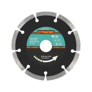 Diamond disc for angle grinders, intended for dry operation, recommended for cutting ceramics, concrete, stone and brick, equipped with segments 7 mm high and 2.3 mm thick, with recommended revolutions of approximately 8400/min. Sthor-08782