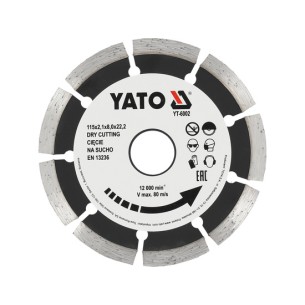 Diamond disc for angle grinders with a diameter of 115 mm and a mount of 22.2 mm, with laser-welded segments of 8 mm high, intended for dry operation when cutting hardened concrete, brick, silicate brick, granite, masonry and stone, with a maximum speed of 12,000 /min and a linear speed of 80 m/s. YT-6002