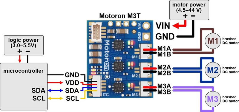 This controller allows independent control of three DC motors using a single I²C bus. It supports motor supply voltages ranging from 4.5 to 44 V and currents up to 0.8 A continuous per channel, making it suitable for a wide range of robotic and mobile applications. I²C communication eliminates the need to generate PWM signals and significantly saves microcontroller pins. The ability to connect multiple controllers on a single bus allows for easy scaling of the system to larger motor counts. Pololu 5084