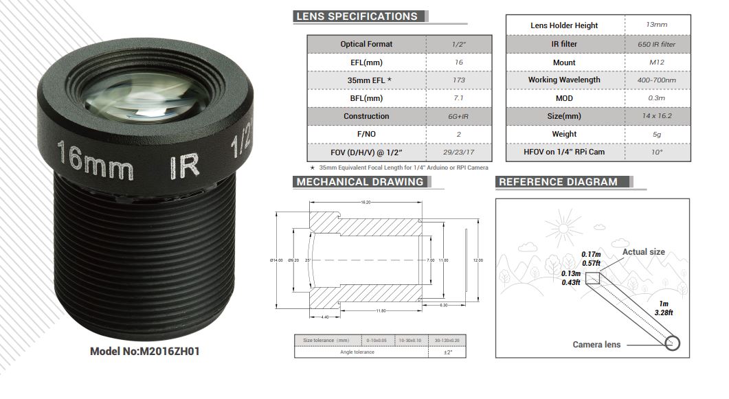 The ArduCam M2016ZH01 is a fixed focal length optical component designed for camera modules with an M12 (S‑mount) thread, commonly used in projects based on Raspberry Pi, Arduino, and in embedded vision systems requiring a narrower field of view. The 16 mm focal length provides a relatively narrow ~29° angle of view, making it suitable for observing objects at medium to long distances.