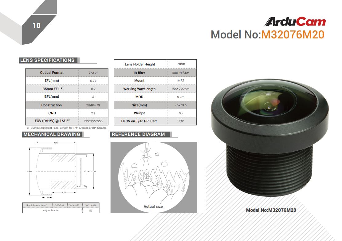 Camera lens with an M12 mount and a 0.76mm focal length, intended for camera modules that require an extremely wide field of view. ArduCam LN010 M32076M20