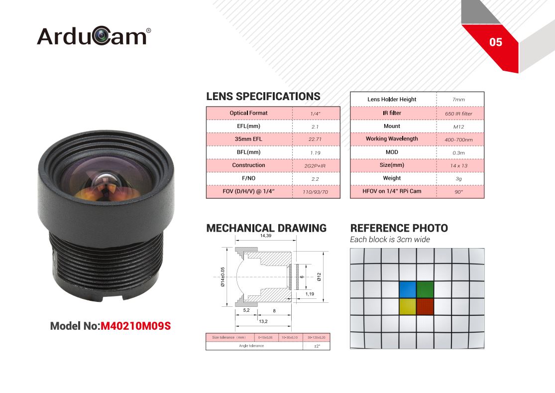 Camera lens with an M12 mount and a 2.1mm focal length featuring reduced geometric distortion, intended for camera modules with 1/4" sensors. ArduCam LN014 M40210M09S