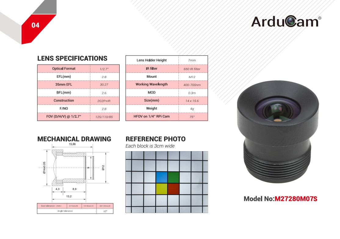 Camera lens with an M12 mount and a 2.8mm focal length featuring reduced geometric distortion, intended for camera modules with 1/2.7" sensors. ArduCam LN013 M27280M07S