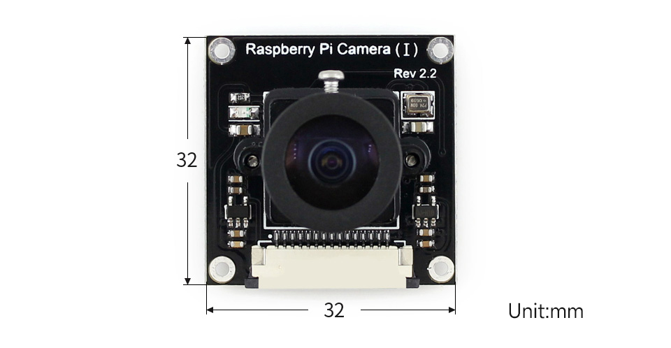 5 MP camera module with OV5647 sensor for Raspberry Pi with MIPI CSI-2 interface (including Raspberry Pi 5, 4B, 3B+, 3A+, Zero, Zero 2W), fisheye lens 1.55 mm, field of view 185°, manual focus adjustment. Waveshare RPi Camera (I)