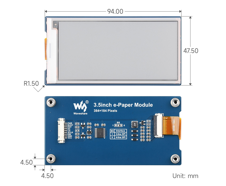 3.5" E-Ink e-paper display with a resolution of 384x184 px supporting red, yellow, black and white colors. The panel is designed for use with an external driver board or controller supporting the SPI interface. Waveshare 3.5inch e-Paper (G)