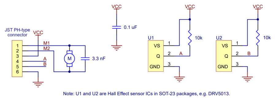 The encoder mounts directly on the back of the motor, with the motor shaft passing through a hole in the board. It is recommended to first attach the board to one motor pin, adjust its position, and then solder the second pin to avoid damaging the brushes. After soldering the board, connect the motor wires to pins M1 and M2 using the 6-pin JST PH connector. The remaining four pins provide power to the sensors and quadrature output signals. The magnetic disc is slid onto the motor shaft after the board is mounted. It should be positioned close to the sensors, but not in contact with them. The optimal position is approximately 1 mm of the shaft protruding beyond the disc surface. This set is ideal for robotics projects, control systems, and motor rotation measurement, offering precise and reliable encoding. Its compact size and lightweight design facilitate integration into prototypes and devices requiring accurate motion control.
