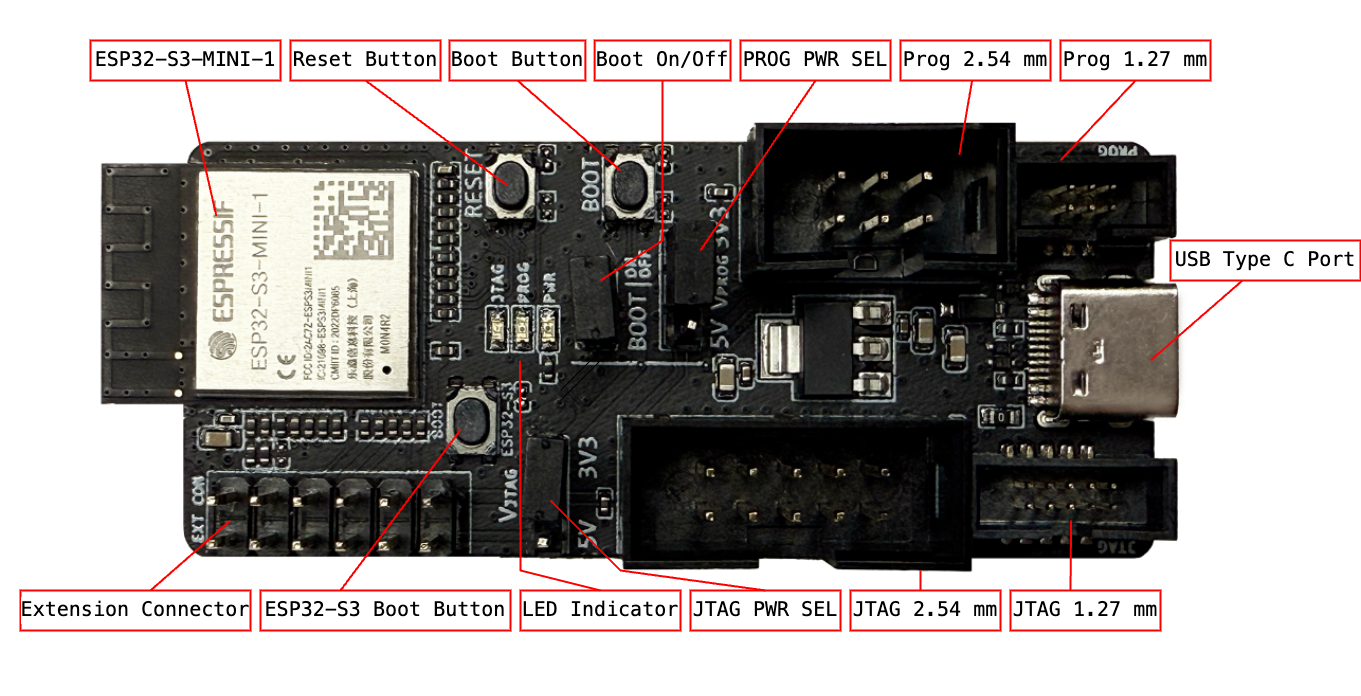 The device integrates UART and JTAG connectors in 1.27 mm and 2.54 mm standards, selectable supply voltage (3.3 V or 5 V) and two USB interfaces, which are recognized by the computer as separate ports. The JTAG and UART communication signals operate only at 3.3 V level. The board uses the ESP32-S3-MINI-1 module to handle communication and control functions. ESP-PROG-2 enables IO expansion mode operation and integration with development platforms such as ESP-IDF.