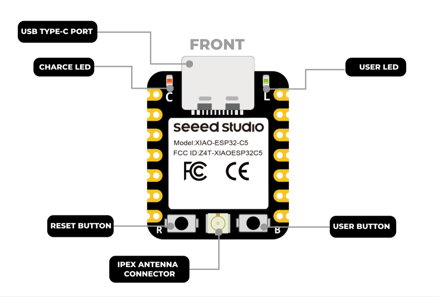 Compact development board based on ESP32-C5 with dual-band WiFi6 2.4GHz and 5GHz, Bluetooth 5 LE, and IEEE 802.15.4, designed for advanced low-power IoT applications. XIAO ESP32-C5