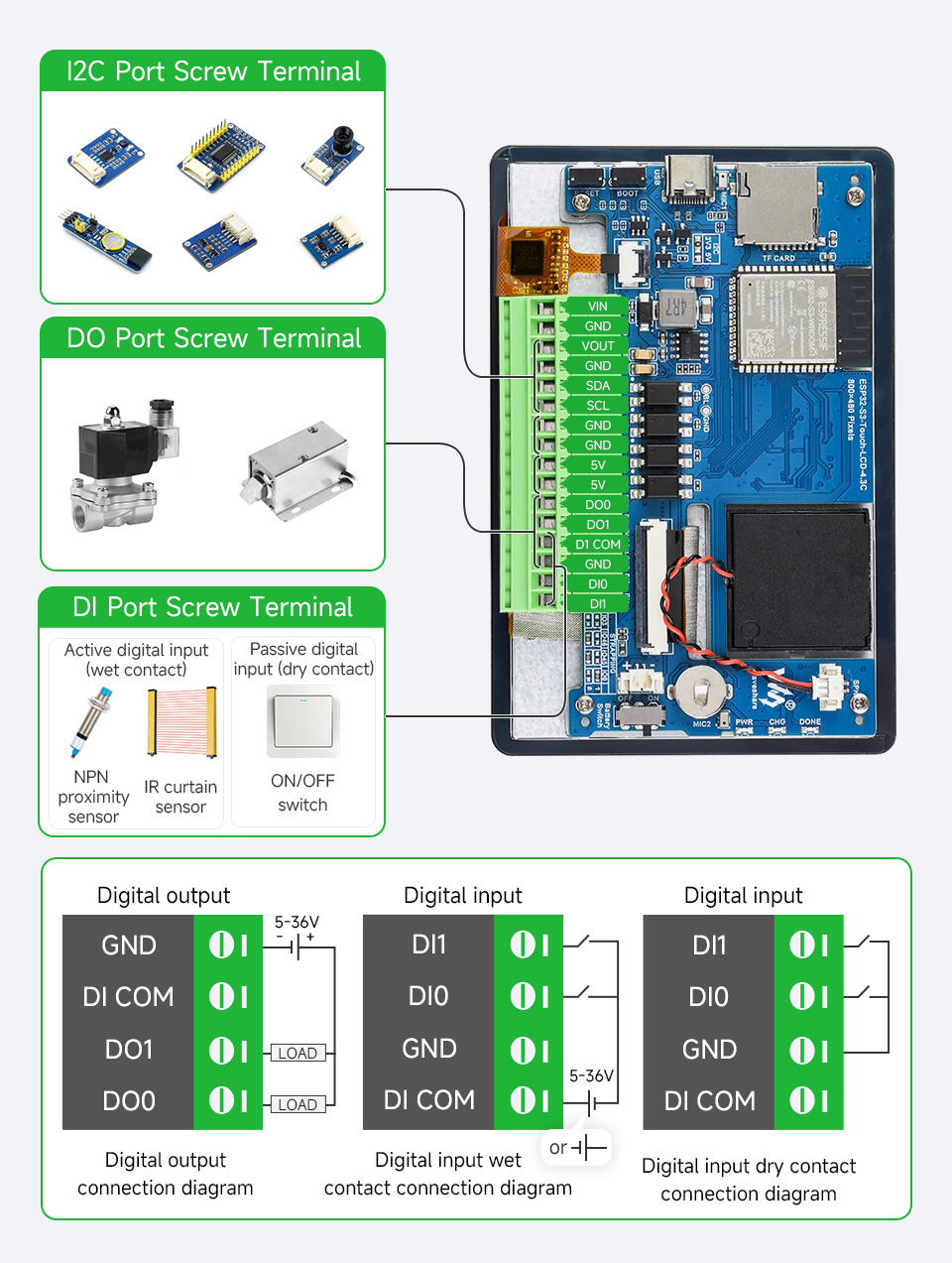 Integrated board with ESP32-P4 and ESP32-C6-MINI and a 7-inch IPS touch screen with a resolution of 1024 × 600 intended for advanced IoT, AIoT, HMI and multimedia processing applications. Thanks to Wi-Fi 6 support, many industrial interfaces and strong security functions, it constitutes a versatile solution for next-generation embedded systems.