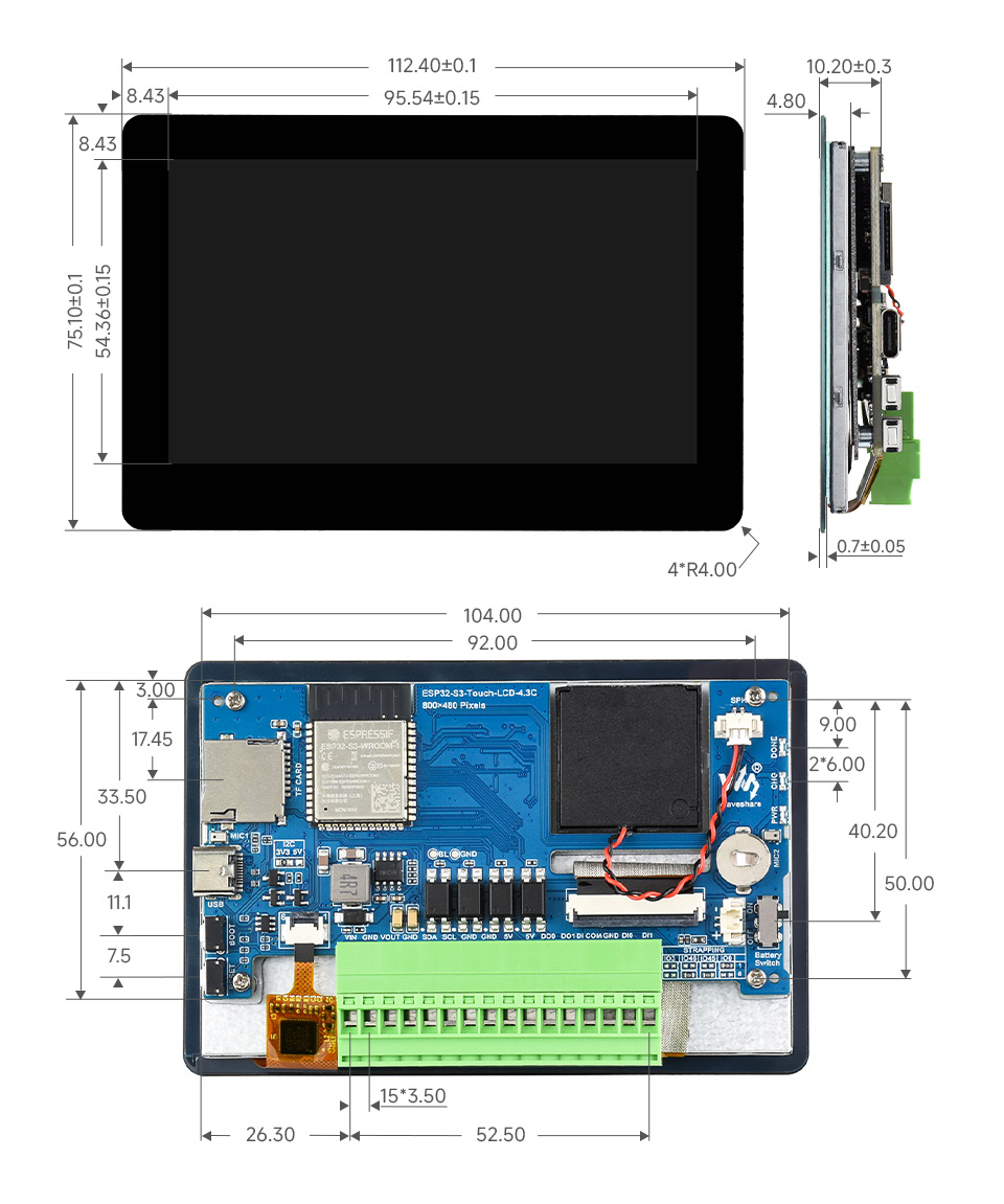Development board with ESP32-S3, featuring a 4.3-inch IPS display 800 x 480 with 5-point capacitive touch, audio codec with dual microphones, and support for 2.4 GHz Wi-Fi and BLE 5. Designed for HMI systems, IoT projects, and voice interface applications. Standard version without case. Waveshare ESP32-S3-Touch-LCD-4.3C