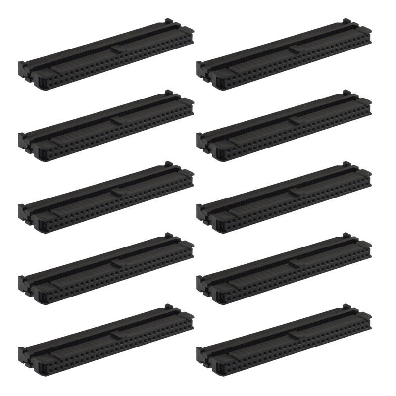 IDC 2.54 mm 64P plug designed for the implementation of very complex connection systems in industrial devices, automation and communication systems. The use of IDC crimping technology allows for quick and reliable connection of 64 flat ribbon cables without soldering. The standard 2.54 mm pitch ensures full compatibility with existing electronic and industrial solutions. conIDC-64P-A conIDC-64P-A