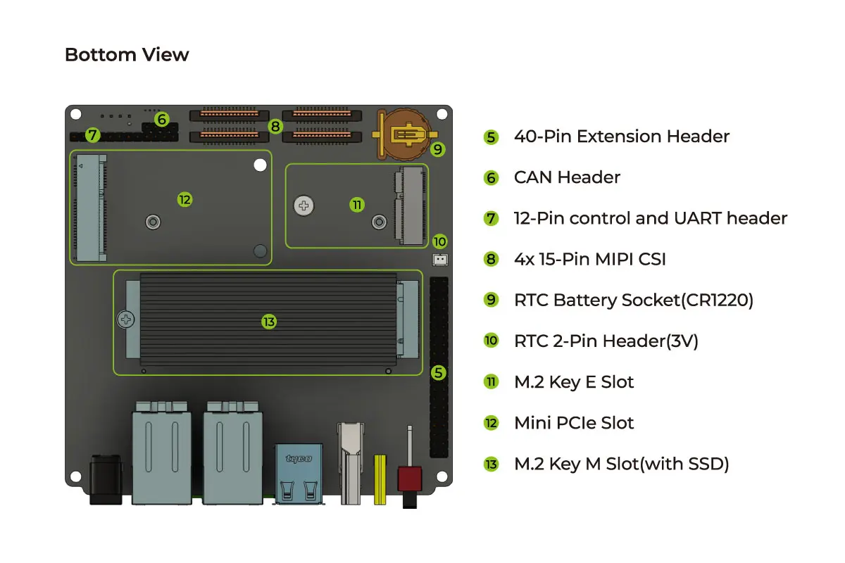 The computer is equipped with a rich set of interfaces, including two Ethernet ports, four USB 3.2, HDMI 2.1, four CSI camera connectors, a CAN interface, and M.2 and mini-PCIe expansion slots. With support for Wi-Fi, Bluetooth, and LTE, as well as a preinstalled JetPack 6.2 system and a 128 GB NVMe drive, the device is ready to use out of the box and supports popular AI frameworks such as NVIDIA Isaac, Hugging Face, and ROS2/ROS1.