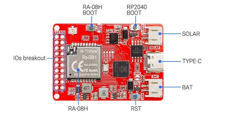 RA-08H LoRaWAN Node is a high-performance communication module designed for data transmission in the 868 MHz band. The device combines the power of the dual-core Raspberry Pi RP2040 microcontroller with the capabilities of the RA-08H module, offering wireless communication across the 803–930 MHz frequency range. The board supports both LoRa point-to-point communication and LoRaWAN networking, making it a versatile solution for IoT applications, smart homes, agriculture, environmental monitoring, and logistics.