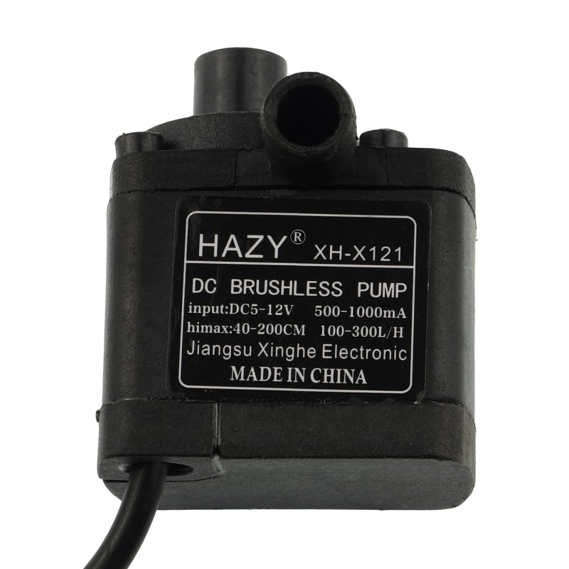 A mini water pump with an flow of 120 l/h designed for home automatic irrigation systems. It is immersed in water, powered with the voltage from 6 to 12 V and has a power of approx. 3.6 W