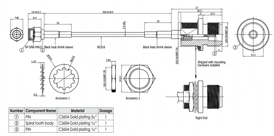 The 300 mm RF cable is a high-quality coaxial cable designed for radio applications requiring stable and low-loss signal transmission. Manufactured to the RG316 standard, it features silver-plated copper conductors and a PTFE dielectric, ensuring excellent electrical performance and minimal signal attenuation across a wide frequency range. With an impedance of 50 Ω and support for frequencies up to 6 GHz, the cable is ideal for RF systems, LoRa, Wi-Fi, and other wireless applications.