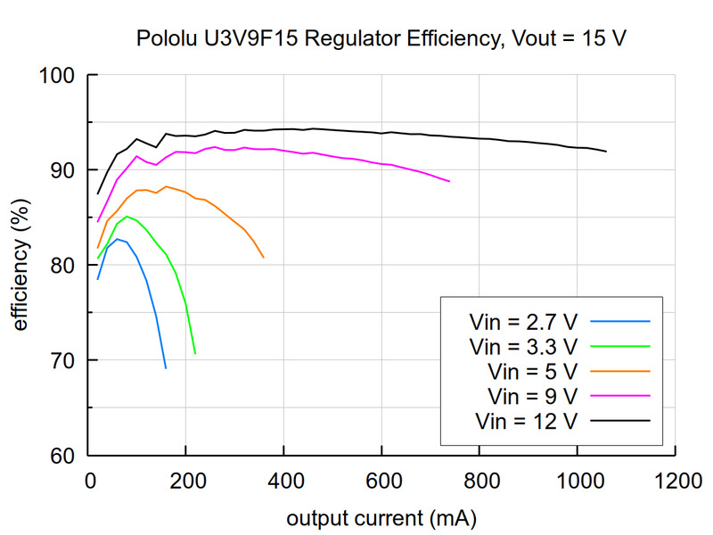A switching converter that stabilizes a 15V voltage from an input range of 2.6V to 20V. It offers high efficiency of 70-95% and the ability to operate with a continuous input current of up to 900mA and a peak current limit of 2.2A. With a switching frequency of 1.6MHz and a power-saving mode, it is suitable for both high-performance and low-power applications. Pololu 5586