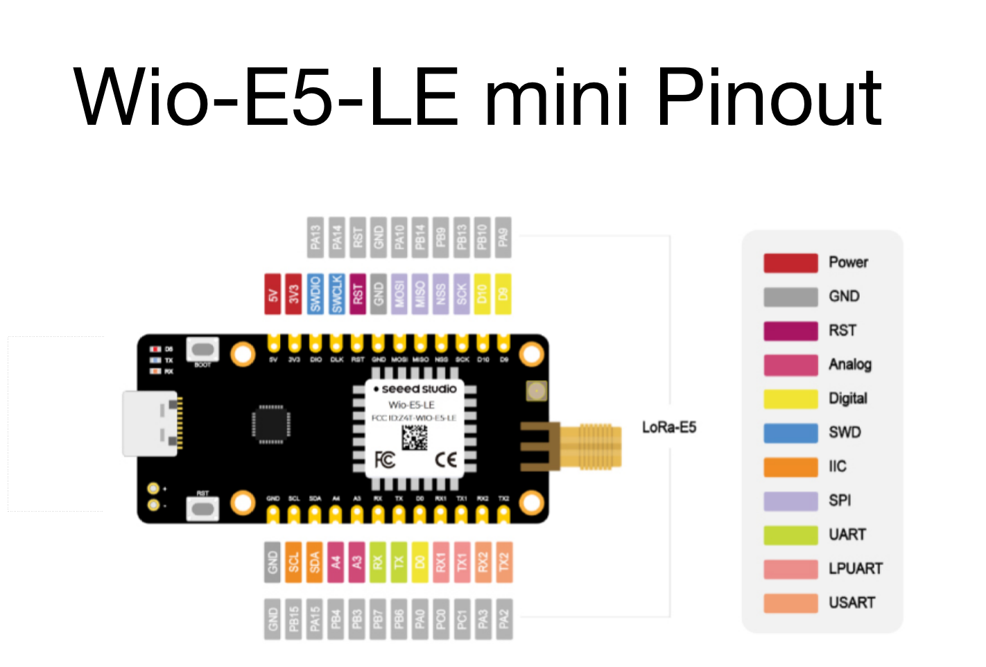 The Wio-E5-LE mini development board provides access to all GPIO lines of the integrated Wio-E5-LE wireless module, equipped with the STM32WLE5JC microcontroller with an ARM Cortex-M4 core and SX126x transceiver. It supports long-range transmission in the EU868 and US915 bands using the LoRa protocol and (G)FSK, (G)MSK, and BPSK modulation. The transmission range reaches up to 10 km in open conditions, and the standby current is 2.1 µA in WOR mode.