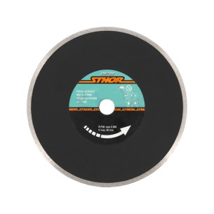 Full diamond disc for angle grinders, equipped with a cutting segment 5 mm high and 2.4 mm thick, intended for wet work, recommended for cutting porcelain, glass, marble and limestone, with recommended revolutions of approximately 6600/min. Sthor-08788