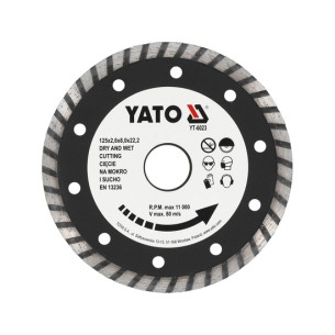 Full diamond disc for angle grinders with a diameter of 115 mm and a mounting of 22.2 mm, with a cutting segment of 5.3 mm in height and 2.1 mm in thickness, intended for "wet" work when cutting ceramic tiles, stoneware, glazed tiles, stone tiles, glass and porcelain, with maximum revolutions of 12,000/min and linear speed of 80 m/s. YT-6012