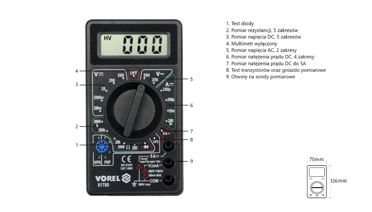 The Vorel 81780 is a digital universal multimeter intended for basic electrical measurements in installation, service, and workshop applications. The device operates with manual range selection and allows measurement of AC and DC voltage up to 500 V, DC current up to 5 A, and resistance up to 2 MΩ.