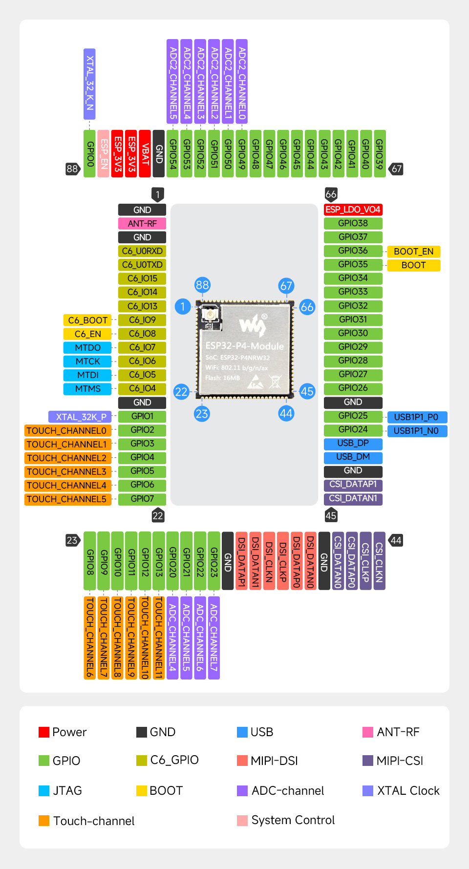 Płytka bazowa firmy Waveshare oparta na dwuchipowym rozwiązaniu ESP32-P4 oraz ESP32-C6, obsługująca łączność 2.4GHz Wi-Fi i Bluetooth 5.3, wyposażona w 32MB pamięci Flash oraz 32MB PSRAM. Waveshare 32604