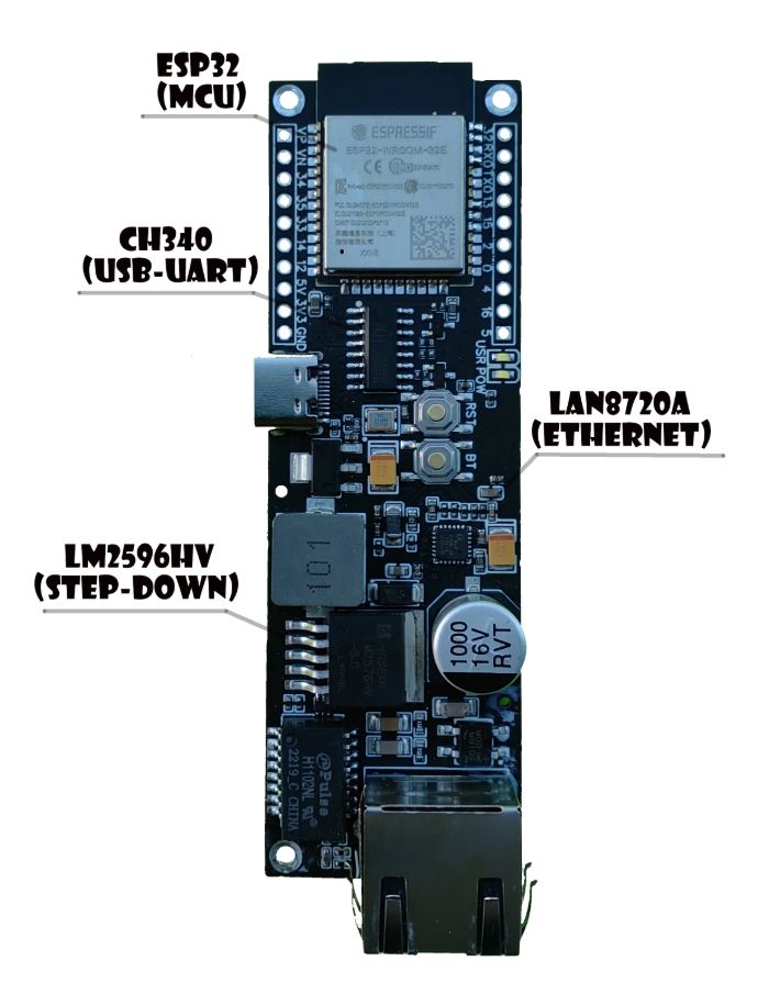 Opis elementów na płytce ESP32-Stick-PoE-P