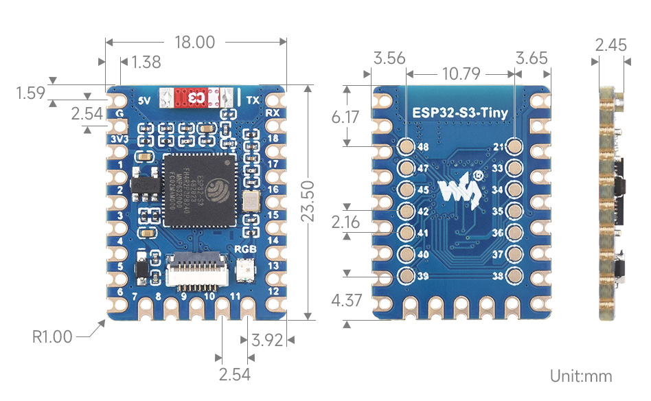 Miniaturowa płytka rozwojowa oparta na ESP32-S3FH4R2 / ESP32-S3-PICO-1-N8R8 z 8 MB Flash i 8 MB PSRAM. Obsługuje Wi-Fi 2,4 GHz oraz Bluetooth 5 LE. Wersja standardowa - bez adaptera USB Typu-C i przewodu FPC. Waveshare ESP32-S3-Tiny-N8R8