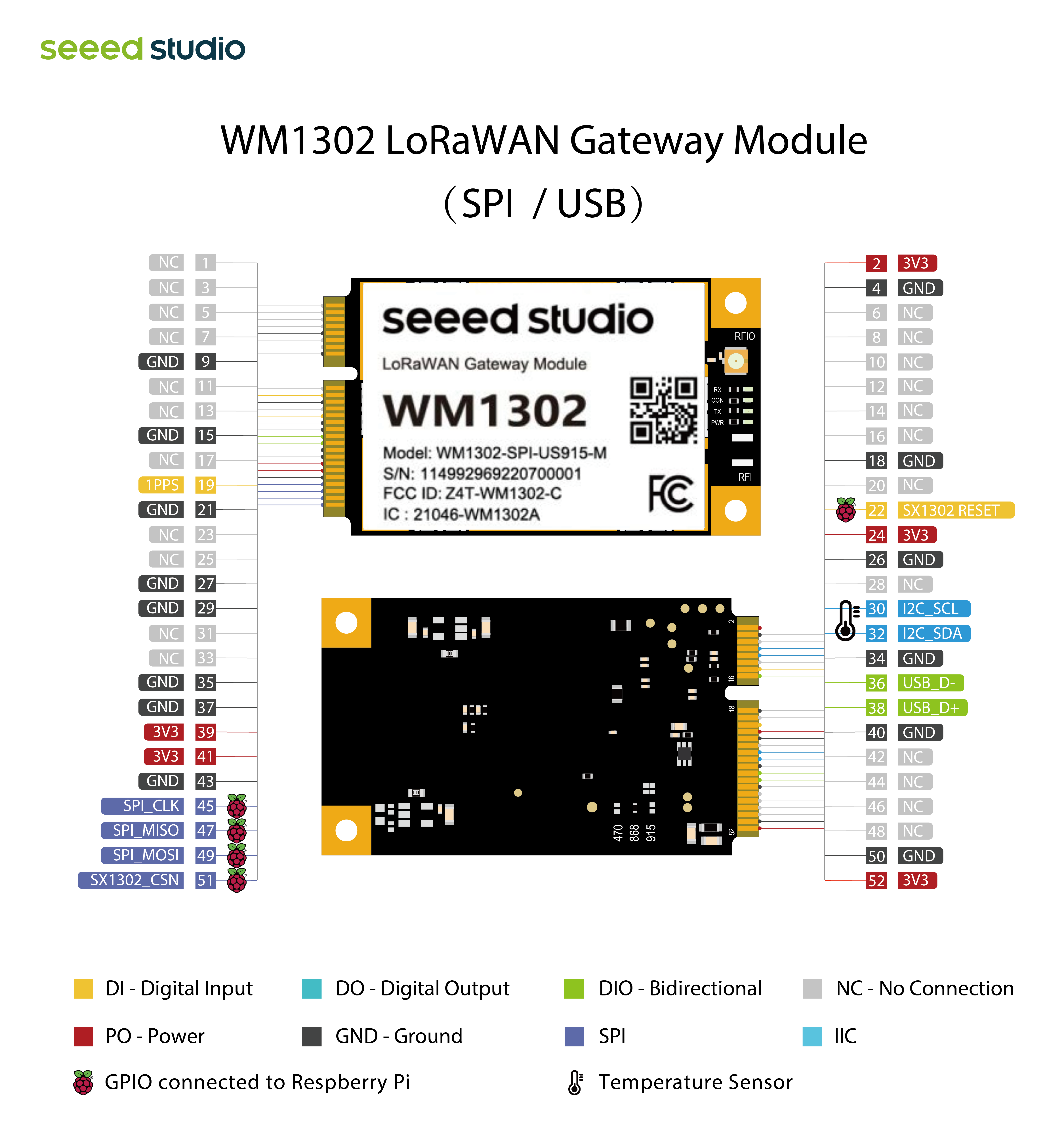 WM1302 LoRaWAN Gateway Module (USB) US915 Seeed Studio 114992991 to moduł bramki LoRaWAN w formacie mini-PCIe oparty na chipie SX1302, przeznaczony do pracy w paśmie US915. Dzięki interfejsowi USB, wysokiej czułości i niskiemu poborowi mocy znajduje zastosowanie w konstrukcji energooszczędnych bramek LPWAN oraz w badaniach nad komunikacją dalekiego zasięgu.