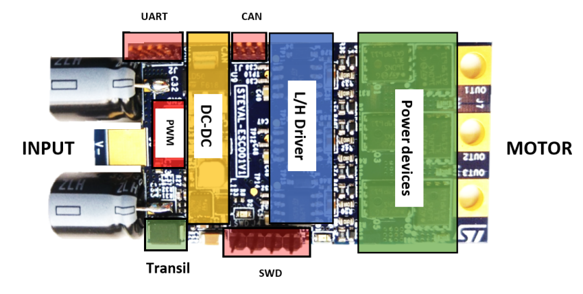 Dzięki obsłudze komunikacji przez PWM, UART, CAN oraz I²C moduł może zostać łatwo zintegrowany z większością kontrolerów lotu stosowanych w dronach komercyjnych. Niewielkie wymiary płytki umożliwiają instalację nawet w bardzo małych konstrukcjach, gdzie liczy się każdy gram i centymetr przestrzeni. Układ oferuje również zabezpieczenie nadprądowe i nadnapięciowe, wbudowany obwód BEC 5 V / 0,5 A oraz czujnik NTC do monitorowania temperatury. Dzięki wykorzystaniu tranzystorów STripFET™ F7 o bardzo niskiej rezystancji Rds(on) moduł gwarantuje wysoką wydajność prądową i niskie straty mocy. To idealne rozwiązanie dla konstruktorów dronów, hobbystów, edukatorów oraz projektantów systemów opartych na silnikach BLDC lub PMSM, którzy potrzebują stabilnego, wydajnego i sprawdzonego projektu ESC.