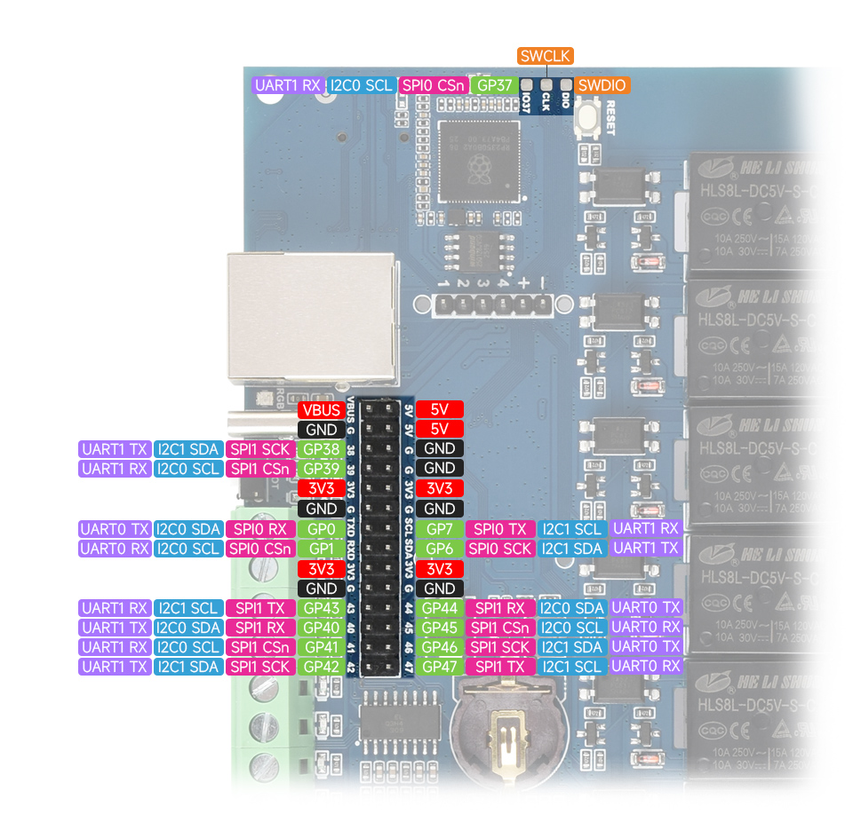 Przemysłowy moduł sterujący z 8 wyjściami przekaźnikowymi i 8 wejściami cyfrowymi, oparty na mikrokontrolerze RP2350B z dwoma rdzeniami i podwójną architekturą (ARM Cortex-M33 / Hazard3 RISC-V), pracującym z częstotliwością do 150 MHz. Wyposażony w port Ethernet z obsługą PoE (zgodność z IEEE 802.3af), RS485 oraz USB typu C.