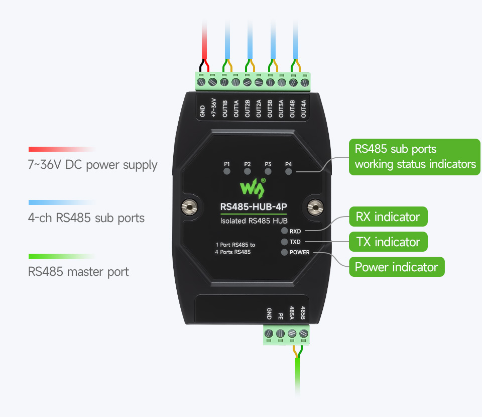RS485-HUB-4P to przemysłowej klasy koncentrator magistrali RS485 umożliwiający rozgałęzienie jednego portu głównego na cztery niezależne porty podrzędne z pełną izolacją galwaniczną. Zastosowany układ przekaźnikowy zapewnia stabilną transmisję sygnału w topologii gwiazdy, co eliminuje zakłócenia typowe dla wielu urządzeń podłączonych równolegle. Rozwiązanie to sprawdza się w systemach akwizycji danych, automatyce, monitoringu, a także bramkach IoT.