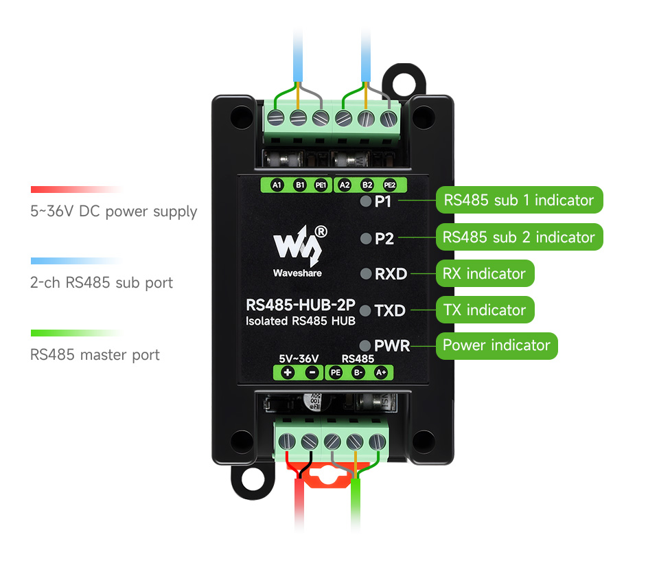 Koncentrator RS485-HUB-2P firmy Waveshare umożliwia rozbudowę jednej magistrali RS485 o dwa dodatkowe porty podrzędne z funkcją przekaźnikowego przekazywania sygnału, izolacją galwaniczną i możliwością pracy w topologii punkt-punkt oraz punkt-wielopunkt. Urządzenie obsługuje transmisję półdupleksową, a każdy port RS485 pozwala na podłączenie do 32 urządzeń. Dzięki izolacji optoelektronicznej i zabezpieczeniom przeciwprzepięciowym, koncentrator może być stosowany w środowiskach przemysłowych wymagających wysokiej niezawodności.