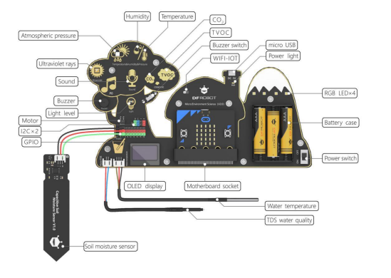 Moduł rozszerzający z czujnikami środowiskowymi przeznaczony do micro:bit. Na płytce zintegrowano czujnik UV, temperatury, wilgotności, ciśnienia powietrza, dźwięku, światła, temperatury wody i jakości wody TDS (Total Dissolved Solids), czujnik wilgotności gleby, TVOC oraz czujnik CO2.