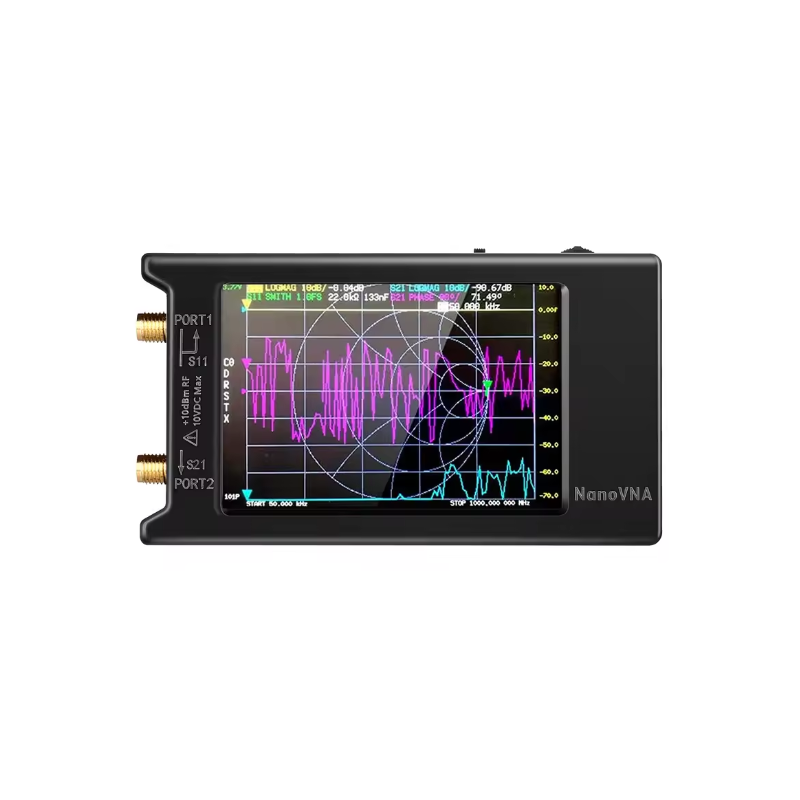 Wektorowy analizator sieci z dwoma portami. Może wykonywać pomiary dla częstotliwości od 50 kHz do 3 GHz. Wyposażony w wyświetlacz LCD, może być podłączony do komputera przez złącze USB. Nanovna V2 2.8"