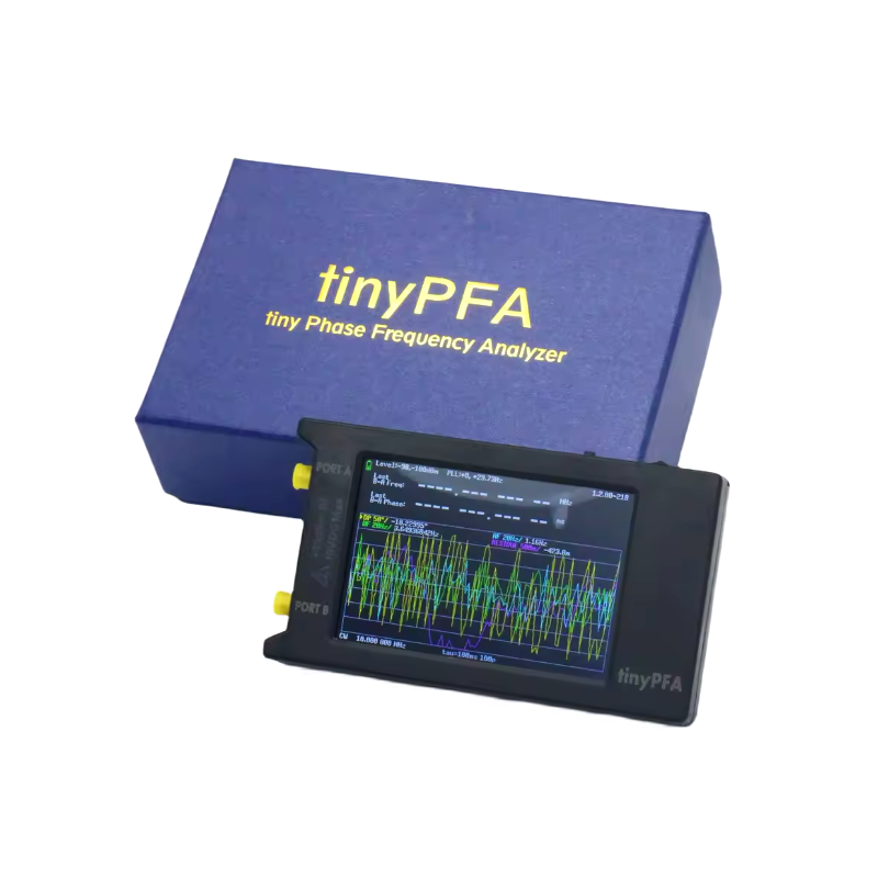 TinyPFA to przenośny analizator częstotliwości i fazy, stworzony z myślą o inżynierach i entuzjastach elektroniki, którzy potrzebują dokładnych pomiarów różnic częstotliwości i fazy pomiędzy dwoma sygnałami. Urządzenie bazuje na sprzęcie NanoVNA-H4 oraz dedykowanym oprogramowaniu, które współpracuje wyłącznie z tym modelem. Wyposażony został w czytelny, 3,95-calowy ekran dotykowy TFT LCD, TinyPFA umożliwia pomiary sygnałów w zakresie od 1 MHz do 300 MHz, co czyni go idealnym do zastosowań takich jak porównanie zegarów 10 MHz. Pomiar różnicy częstotliwości i fazy może być prezentowany numerycznie, w formie wykresu w czasie, a dane można zapisać na karcie microSD lub przesłać do komputera przez USB do dalszej analizy (np. w oprogramowaniu TimeLab).