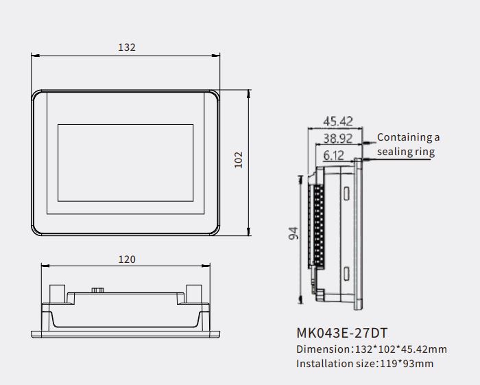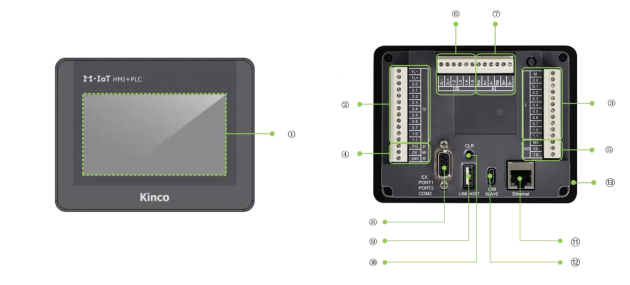 Kinco MK043E-27DT to zintegrowany panel operatorski HMI z wbudowanym sterownikiem PLC przeznaczony do zastosowań przemysłowych wymagających kompaktowych wymiarów i elastycznej konfiguracji wejść i wyjść. Urządzenie wyposażono w wyświetlacz 4,3" TFT o rozdzielczości 480 x 272 px oraz rezystancyjny panel dotykowy, umożliwiający wygodną obsługę interfejsu w środowisku przemysłowym.