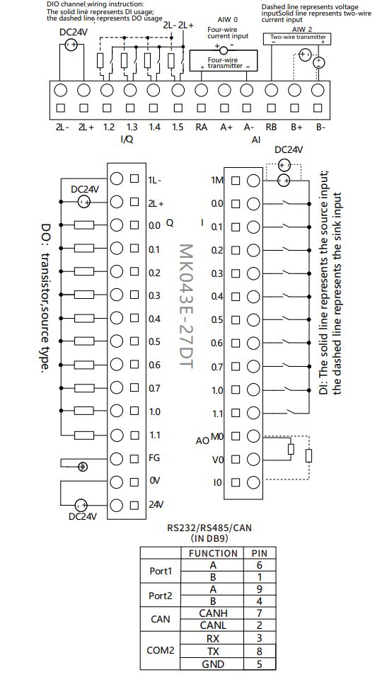 Panel operatorski HMI 4,3" TFT 480x272 z wbudowanym sterownikiem PLC, 10 wejść DI 24VDC, 10 wyjść DO 24VDC, 4xDIO, 2 wejścia AI, 1 wyjście AO, 2xRS485, RS232, Ethernet, USB, obsługa do 8 modułów KS. Kinco MK043E-27DT