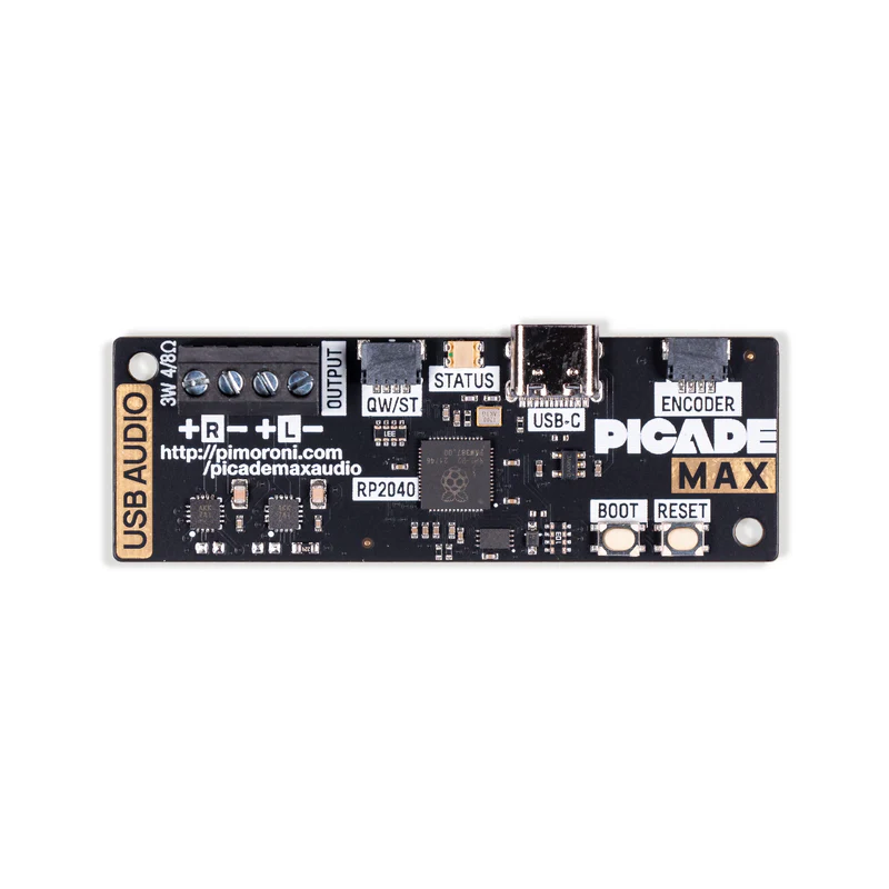 Moduł z mikrokontrolerem RP2040 oraz cyfrowym przetwornikiem I2S DAC i wbudowanym wzmacniaczem stereo 3W, umożliwiający podłączenie głośników do Raspberry Pi lub komputera przez USB-C. Zapewnia czysty dźwięk bez potrzeby korzystania z gniazda 3.5 mm jack i oferuje łatwe podłączenie głośników przez zaciski śrubowe bez lutowania. Wyposażony jest w złącze na enkoder głośności oraz port Qw/ST do integracji z innymi modułami przez I2C. Pimoroni PIM742