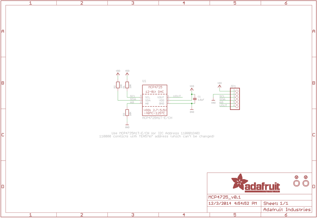Moduł z 12-bitowym przetwornikiem DAC MCP4725 oraz wbudowaną pamięcią EEPROM. Wyposażony w złącze STEMMA QT, komunikuje się przez interfejs I2C. Adafruit 935