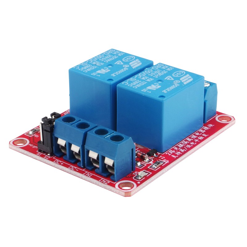 Moduł zawiera dwa przekaźniki 5V o maksymalnym prądzie 10A (250 VAC) oraz optoizolowane wejścia, zaś przy pomocy zworek możliwy jest wybór załączania stanem wysokim bądź niskim. Moduł wyposażony jest w złącza śrubowe. modRL02_ISO