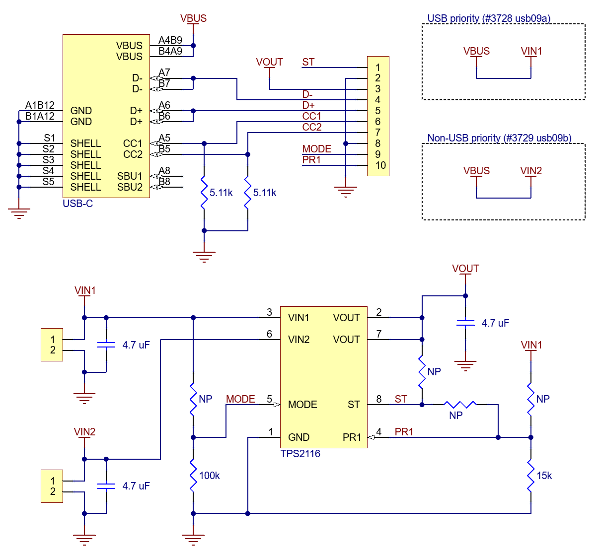 W wersji z priorytetem USB złącze USB Type-C podłączone jest do wejścia VIN1, które w trybie priorytetowym stanowi źródło preferowane. Przy obecności napięcia na linii USB zasilanie wyjściowe pobierane jest z tego wejścia, natomiast w przypadku jego zaniku następuje automatyczne przełączenie na drugie źródło. Możliwa konfiguracja pozwala również na sterowane przełączanie między VIN1 i VIN2 oraz ustawienie progu przełączania. Zintegrowane tranzystory MOSFET o niskiej rezystancji kanału umożliwiają pracę z ciągłym prądem do 2,5 A przy zachowaniu wysokiej sprawności.