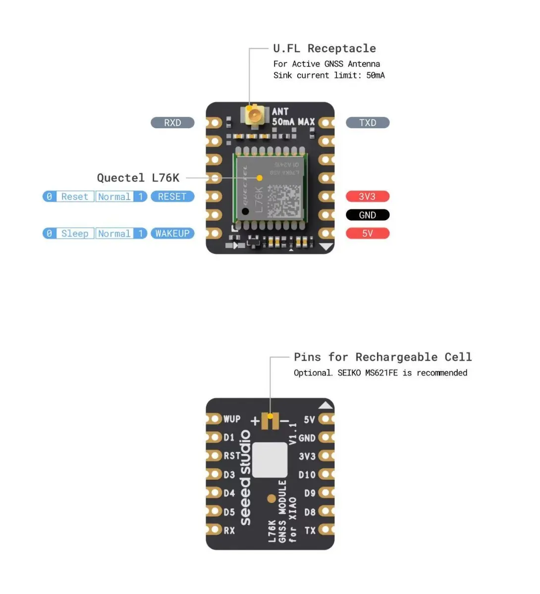 Moduł może być używany z wszystkimi płytkami Seeed Studio XIAO, oferując wszechstronną obsługę różnych systemów satelitarnych, co zapewnia elastyczność i dokładność w różnych zastosowaniach. Dzięki funkcjonalności AGNSS, moduł gwarantuje szybkie ustalenie pozycji w trudnych warunkach. Dodatkowo przewidziane jest miejsce do przylutowania diody LED, która umożliwia wizualną kontrolę stanu połączenia GPS, ułatwiając diagnostykę i poprawiając komfort użytkowania.