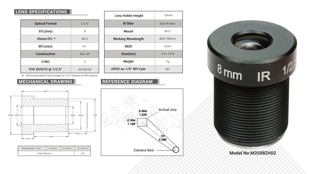 Obiektyw ArduCam M2508ZH02 wykorzystywany jest jako standardowy, stałoogniskowy komponent optyczny do modułów kamery z mocowaniem M12, stosowanych m.in. w projektach opartych na płytkach Raspberry Pi oraz Arduino. Zapewnia on ogniskową 8 mm, co przekłada się na stosunkowo wąskie pole widzenia, umożliwiające uzyskiwanie kadru bardziej skoncentrowanego na szczegółach obiektu.