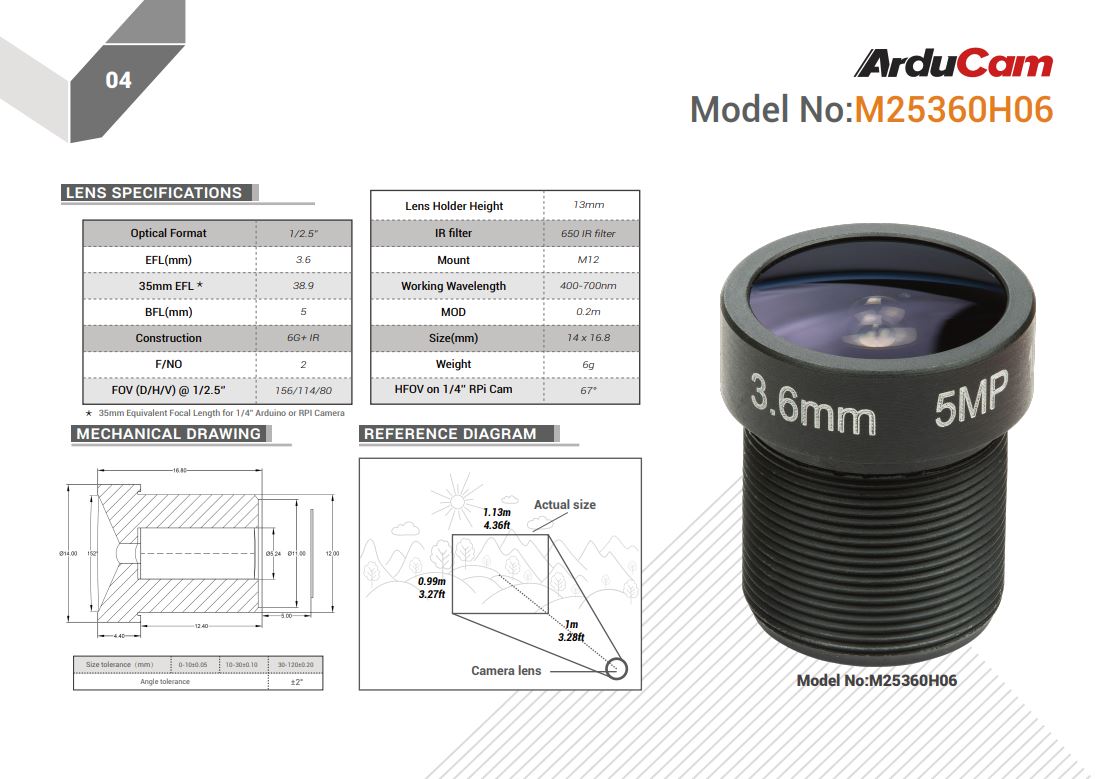 Obiektyw kamerowy z mocowaniem M12 i ogniskową 3.6 mm, przeznaczony do modułów kamerowych z matrycami 1/2.5", wyposażony w filtr IR 650 nm. ArduCam LN004 M25360H06