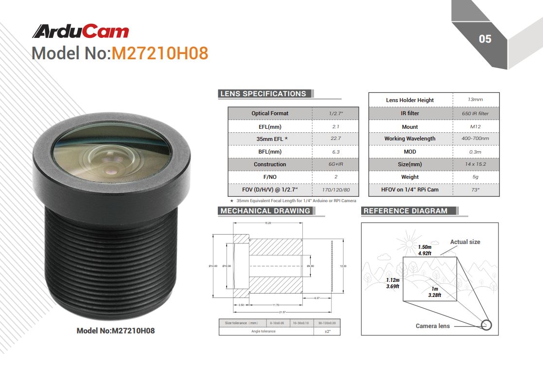 Obiektyw kamerowy z mocowaniem M12 i ogniskową 2.1mm, przeznaczony do modułów kamerowych z matrycami 1/2.7", stosowany w systemach wizyjnych wymagających szerokiego pola widzenia. ArduCam LN005 M27210H08